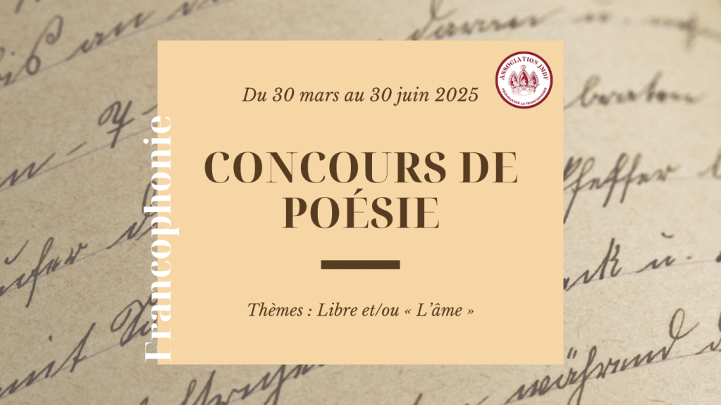 L’association est heureuse de lancer son premier concours de poésie, ouvert à tous les passionnés francophones de poésie, du 30 mars au 30 juin 2025. Les participants (collégiens, lycéens, étudiants ou adultes) sont invités à participer sur l’un des deux thèmes proposés : Libre (au choix) et/ou l’âme.